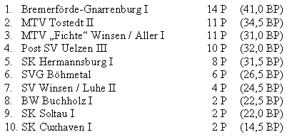 Und so sieht nun die Tabelle der Bezirksliga, 2 Spielrunden vor Schluss, aus (BP=Brettpunkte):