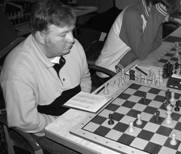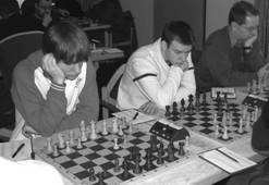 Der Start war entsprechend. André Liebich baute eine so komplizierte Stellung auf, dass er schließlich selbst nicht mehr darin zurechtfand und als erster das Handtuch werfen musste (0:1). Ingo Vogler folgte ihm auf dem Fuße, ohne einen großen Fehler wurde er überspielt (0:2). Helge Gravemeyer kam erst durch einen Fingerfehler seines Gegners in Vorteil, indem dieser eigentlich einen Deckungszug ausführen wollte, mit seiner Figur aber versehentlich ein Feld zu weit zog und die nicht gedeckte Figur verlor. Bei ungefährem Gleichstand bot Helge dann Remis an, sein Gegner war aber durch den vorangegangenen Fehler dermaßen aus der Bahn geworfen, dass er immer noch einen Vorteil für sich zu sehen meinte und deswegen dann auch prompt verlor (1:2). Dr.Jahns hatte mit seinem Gegner weniger Kurzweil. Nach einer ruhig durchkonstruierten Partie erfolgte die konsequente Abwicklung zum Sieg (2:2).