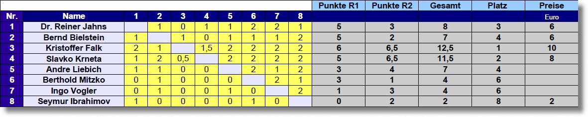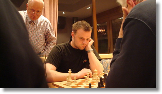 Kristoffer Falk entschied sich für Schach und nicht für Fußball. Eine weitere Überraschung hielt der erste Durchgang in Form von Gerhard Rufert bereit. Gerhard, überzeugter Jünger eines gepflegten, Rehagelschen Standfußballs, war heute eigentlich nur anwesend, weil er mal wieder nicht wusste, dass an diesem Abend ein Blitzturneier stattfindet. Um so überraschender sein Abschneiden. Nach Durchgang 1 fand er sich auf dem dritten Platz wieder, noch vor Ballkünstlern wie André Liebich (Kolumbien), der sich heute ein ums andere mal im Dschungel der Varianten verdribbelte und schlimmstes fürchten musste.