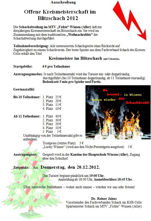 darüber hinaus!)! Wegen des neuen Niedersächsischen Gaststättengesetzes (oder so ähnlich heißt es) ist es uns nicht erlaubt, Ess- oder Trinkbares zum Verkauf anzubieten; bringt daher bitte vorsichtshalber Euren Flüssigkeitsbedarf selbst mit - das Mitführen und Verbrauchen von Getränken am Schachbrett ist glücklicherweise noch erlaubt.... Es wäre schön, wenn möglichst viele Schachfreunde in der kurzen Ruhephase vor dem weihnachtlichen Sturm bei einem schönen Blitzschachturnier einen anregenden Abend bei uns verbringen würden. Und zu gewinnen gibt's auch was! Wir freuen uns auf Euch! Herzliche Grüße Dr. Jahns