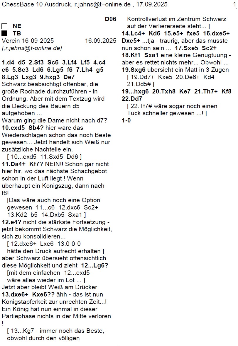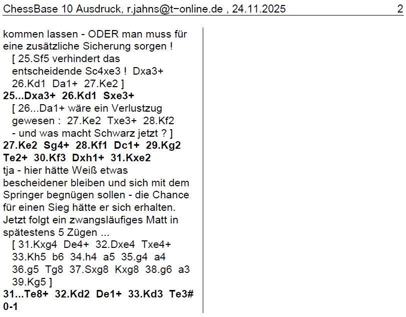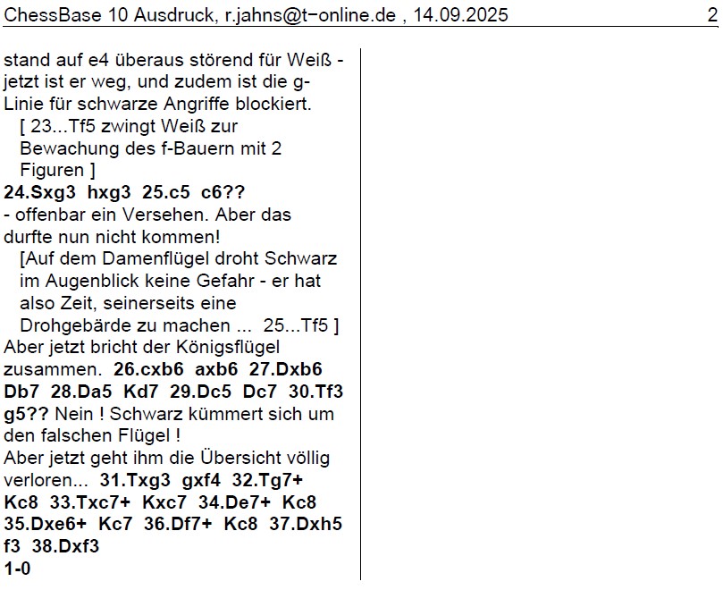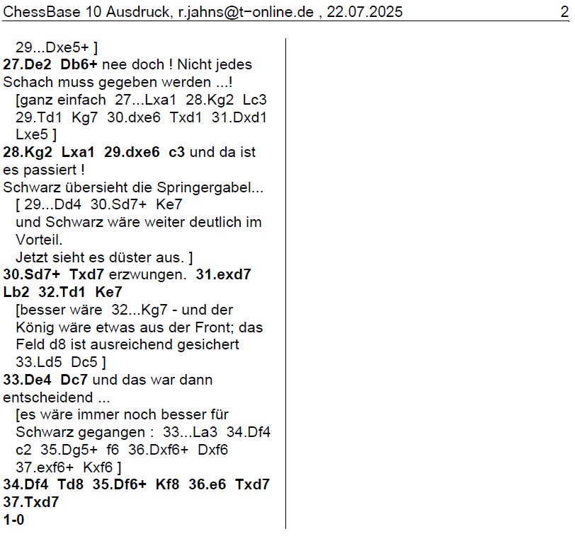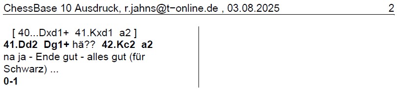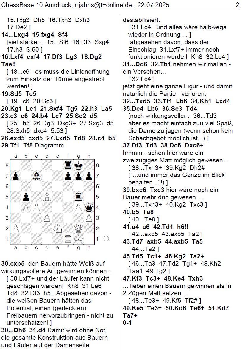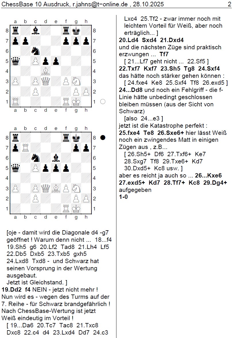In dieser Partie widerstehen beide Spieler lange Zeit der Versuchung einer effektiven Figurenentwicklung… Mehrfach werden so vielversprechende Möglichkeiten verspielt, auf beiden Seiten. Entschieden wird dann die Partie durch Übersehen eines einzügigen Matts.
