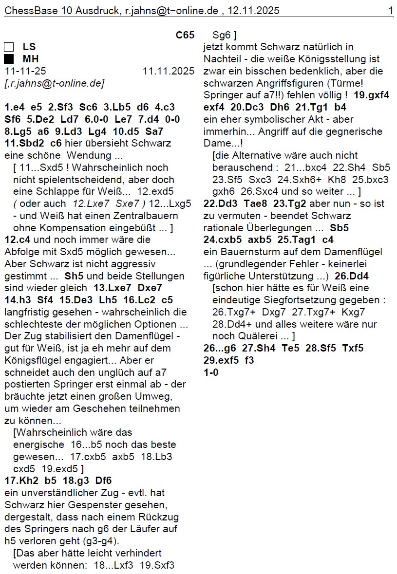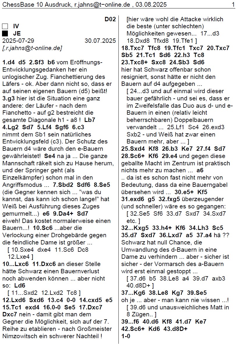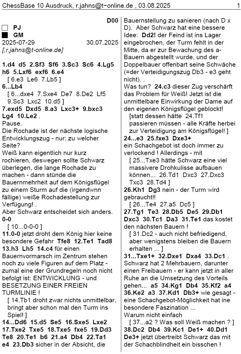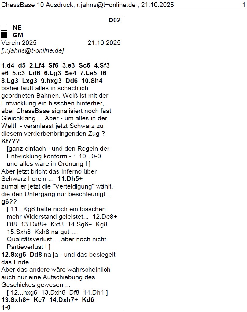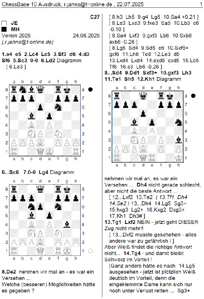 In dieser Partie widerstehen beide Spieler lange Zeit der Versuchung einer effektiven Figurenentwicklung… Mehrfach werden so vielversprechende Möglichkeiten verspielt, auf beiden Seiten. Entschieden wird dann die Partie durch Übersehen eines einzügigen Matts.