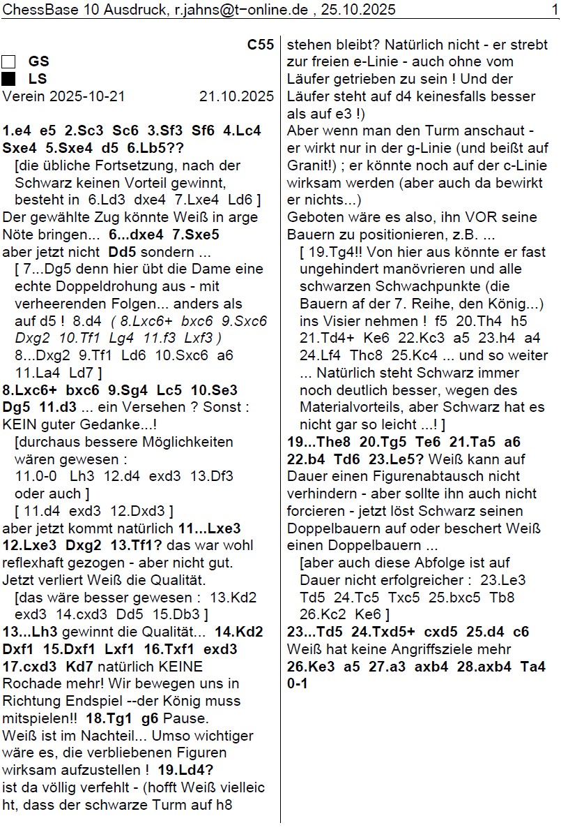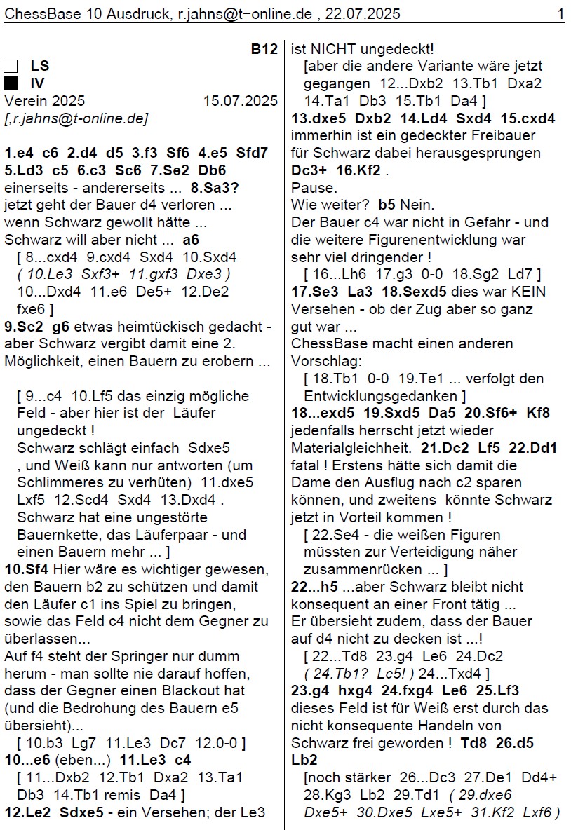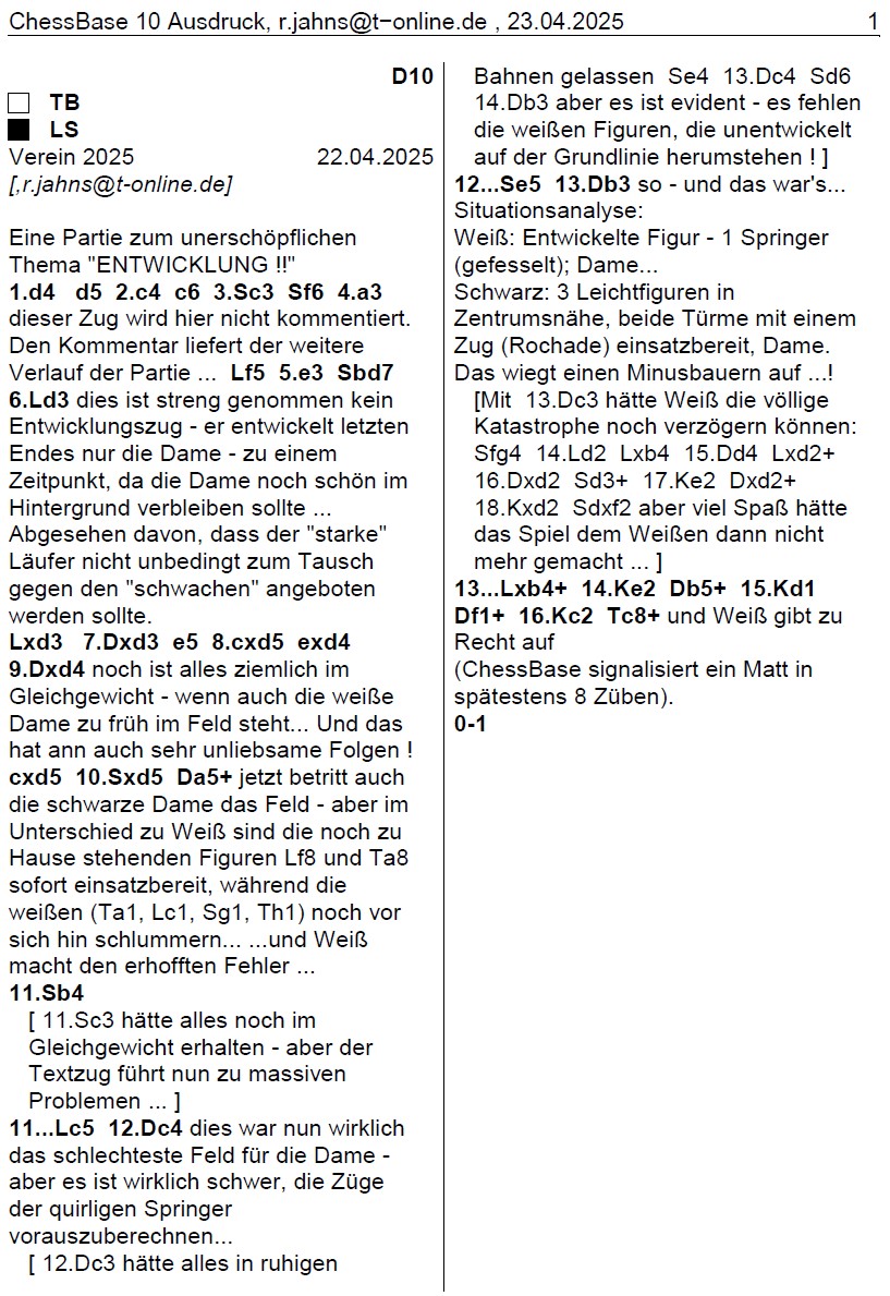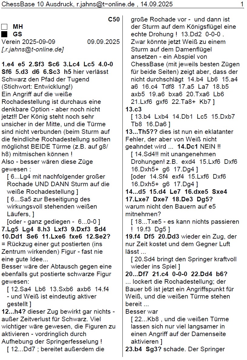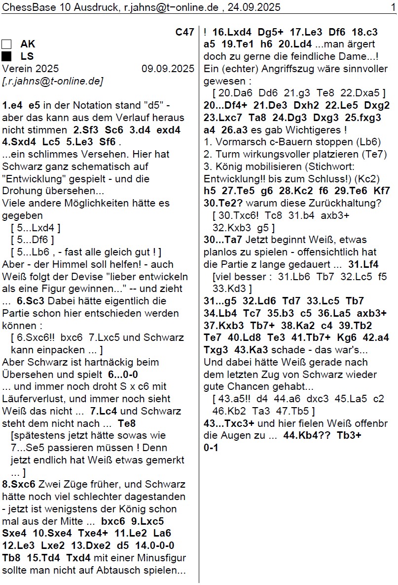 In dieser Partie widerstehen beide Spieler lange Zeit der Versuchung einer effektiven Figurenentwicklung… Mehrfach werden so vielversprechende Möglichkeiten verspielt, auf beiden Seiten. Entschieden wird dann die Partie durch Übersehen eines einzügigen Matts.