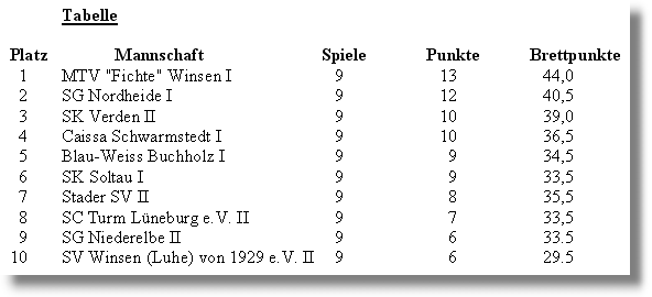 Nun kam es eigentlich nicht mehr darauf an - der Aufstieg war uns nicht mehr zu nehmen. Aber wir hatten ja noch einen gewissen Frust vom letzten Spieltag her abzuarbeiten - und so ging es in den folgenden 2 Stunden noch munter weiter: Trotz verbissener Gegenwehr Siege von Bernd Bielstein (5:0), Kristoffer Falk (6:0) und schließlich auch Tobias Falk (7:0) - und auch Eckart Habermann hatte bei guter Angriffsstellung noch sehr gute Chancen auf einen siegreichen Partie-Abschluss, aber es fehlten ihm einige Sekunden Bedenkzeit und er schaffte seinen 40. Zug nicht mehr in der vorgeschriebenen Zeit (7:1). Wie gesagt, erneut ein Desaster - für die Schwarmstedter, und das fanden wir dann ganz in Ordnung. Damit ist die Saison 2007/2008 abgeschlossen - höchst erfolgreich für die 1. Mannschaft des MTV "Fichte" Winsen (Aller), denn der Aufstieg in die Bezirks-Oberliga war schon mehrfach greifbar nahe gewesen, aber im entscheidenden Augenblick hatte es dann doch nicht geklappt. In dieser Saison dagegen lief es bis auf ein-zwei kleine Ausrutscher hervorragend. Und als Sahnehäubchen erwies es sich noch, dass der auf Platz 1 residierende Mitaufsteiger SG Nordheide (Jesteburg), der uns vor 2 Wochen die unangenehme Überraschung beschert hatte, ausgerechnet heute patzte, gegen Soltau verlor und damit seinen ersten Platz einbüßte. Damit beendet Winsen, wie der Blick auf die Tabelle zeigt, die laufende Saison auch noch als Tabellenführer! Nun schauen wir gespannt der nächsten Saison entgegen - wir lassen von uns hören! |